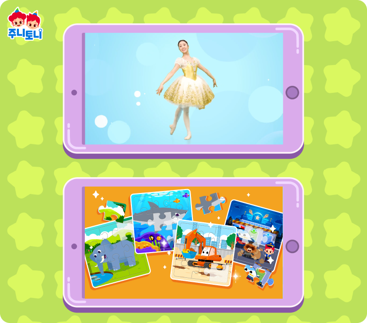 아이들은 주니토니의 인기 동요에 맞춰 즐겁게 몸을 움직이고, 다양한 미션을 함께 해결합니다.