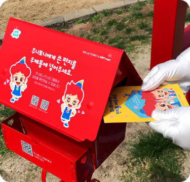 액티비티 키트의 엽서에 주니토니에게 하고 싶은 이야기들을 적어 벨포레 목장 전망대의 우체통에 넣으면,